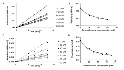 Figure 9 Selected kinetics traces run at different concentrations for the tested chemical fragments benzophenone (A and B), and 2-aminohexanol (C and D).
