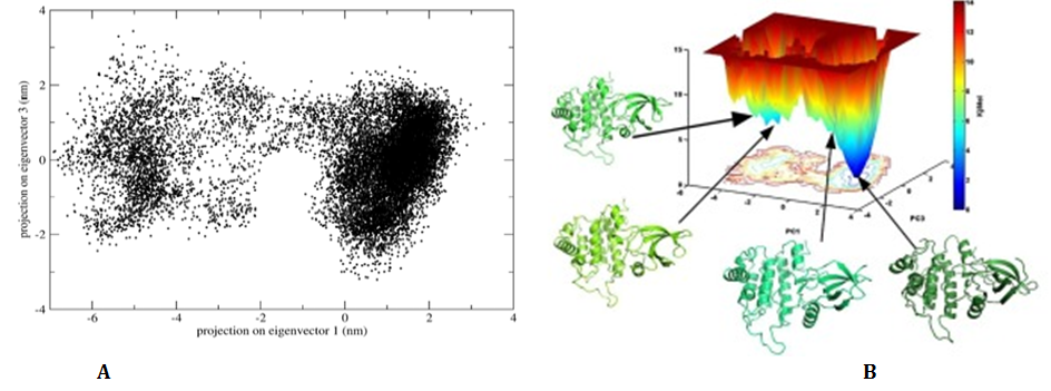 HSPs are the molecular chaperones that participate in preserving the functional conformations of a variety of proteins and thus support the cell survival under heat stress. Under the elevated temperature HSPs go through large conformational changes to sustain the effect of heat, therefore the conformational analysis of the HSPs becomes vitally important to understand their functioning at high temperatures. The conformational analysis of proteins can be performed on MD simulation data. The principal component analyses are used to mine the huge conformational space of proteins.25 The potential energy surface (PES) of the proteins represents the hyper surface of its potential energy as a function of coordinates. Molecular dynamics together with essential dynamics offers a sampling of the protein conformations from which the free energy landscapes are generated to assist the conformational analysis26 (Figure 1). Singh et al.,27 has shown MD simulation based conformational studies of B. subtilis lipases at different temperatures, similar studies on the modeled wheat HSPs can be performed at different temperatures to understand the effect of heat stress on the HSPs conformations and improvement wheat varieties.