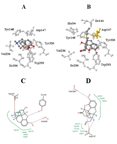 The product of dopamine and acetaldehyde conjugation is known under the name salsolinol.12 That compound has some structural similarities with morphine, as well as with naloxone. According to the docking results, S-salsolinol makes hydrogen bonds just with Asp147, just with Tyr326, or with both of them in all the 200 runs of the Docking Server. The average ΔG for those 200 runs is -5.72kcal/mol. unexpectedly, the results for R-salsolinol are very similar: hydrogen bond with Asp147 can be found in all the 200 runs, while ΔG is significantly lower (-6.87kcal/mol).