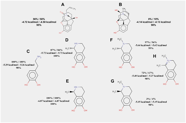 Figure 2 The results of dopamine, its conjugates with acetaldehyde, and their derivatives docking to the mu-opioid receptor. Frequencies of hydrogen bond formation (first line) and average free energies of binding (second line) are given for two rigid docking experiments (100 runs in each). Frequency of hydrogen bond formation is also given for flexible docking (third line) for each of the compounds listed below