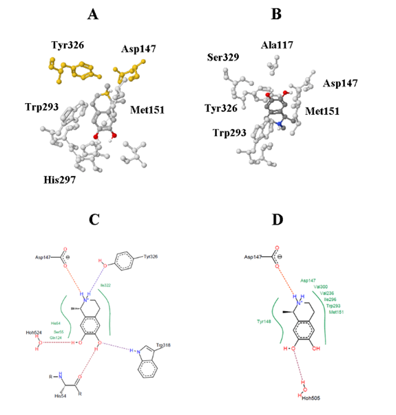 The results of the Docking Server show that the known phenomenon of mu-opioid stereospecificity relative to salsolinol12 is linked to its N-methylated derivative rather than to salsolinol itself. N-methyl-R-salsolinol behaves like morphine analog in case if we perform rigid docking experiments with the 5C1M structure. Indeed, in Figure 3A one can see that both Tyr326 and Asp147 are making hydrogen bonds to the nitrogen atom of N-methyl-S-salsolinol according to the best result of rigid docking. The most frequent result of the same rigid docking for R-methyl-salsolinol (Figure 3B) shows that nitrogen atom is situated far from Asp147 and Tyr326 residues.