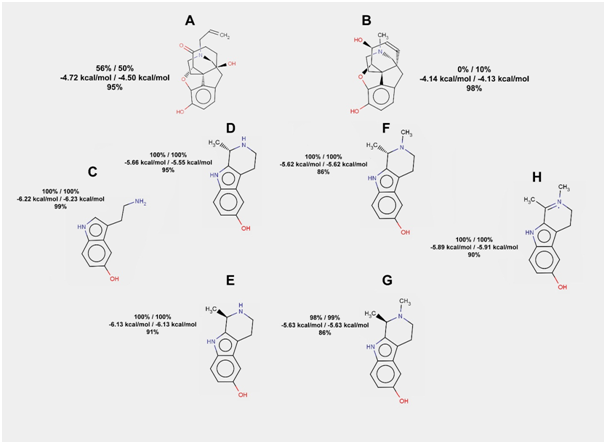 Figure 4 The results of serotonin, its conjugates with acetaldehyde, and their derivatives docking to the mu-opioid receptor. Frequencies of hydrogen bond formation (first line) and average free energies of binding (second line) are given for two rigid docking experiments (100 runs in each). Frequency of hydrogen bond formation is also given for flexible docking (third line) for each of the compounds listed below