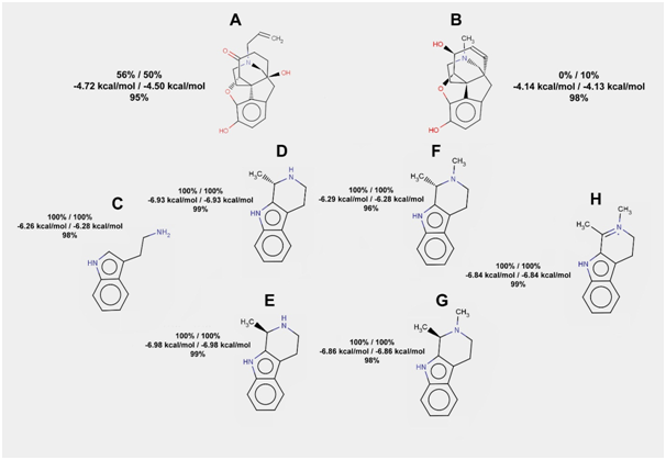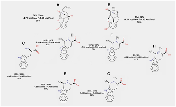Figure 5 The results of tryptamine, its conjugates with acetaldehyde, and their derivatives docking to the mu-opioid receptor. Frequencies of hydrogen bond formation (first line) and average free energies of binding (second line) are given for two rigid docking experiments (100 runs in each). Frequency of hydrogen bond formation is also given for flexible docking (third line) for each of the compounds listed below