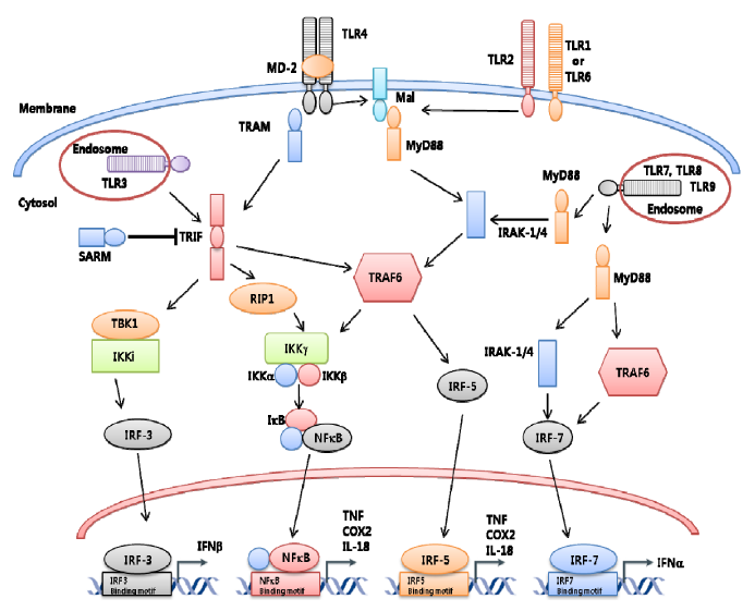 The TLR signaling pathways arise from the cytoplasmic Toll/IL-1 receptor (TIR) domain upon ligand binding. The TIR-containing cytosolic adaptor proteins, such as Myeloid differentiation primary response protein 88 (MyD88), TIR-domain containing adapter protein (TIRAP) and TIR domain-containing adaptor inducing IFN-β (TRIF), modulate TLR signaling pathways.34 TLR signaling consists of a MyD88-dependent pathway that is common to all TLRs except TLR3,35 and a MyD88-independent pathway that is distinguishing to the TLR3 and TLR4 signaling pathways.