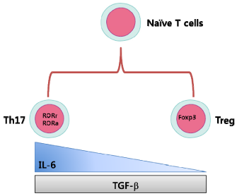 A balance between Th17 and Treg is crucial for immune homeostasis and the plasticity in the Th17 and Treg developmental programs play pivotal role in the development of balanced immune response through regulated differentiation of anti-inflammatory Tregs and proinflammatory Th17 cells from naïve precursors. Though, natural Tregs (nTregs) develop during thymic selection through a mechanism independent of TGF-β, the extrathymic development of induced Tregs (iTregs), is TGF-β-dependent. Development of Th17 cells is also TGF-β-dependent, but additional coordinate signaling by IL-6, produced by dendritic cells activated by microbial products, is required in concert with TGF-β to induce Th17 differentiation. Thus, in the absence of proinflammatory signals from the innate immune system, priming of naïve CD4 T cells by antigen in the presence of active TGF-β promotes development of iTregs, whereas activation in an environment where both active TGF-β and IL-6 are available promotes Th17 development. Because TGF-β suppresses Th1 and Th2 differentiation,68 iTreg and Th17 development are favored in its presence. The transcription factor central to Th17 differentiation is an isoform of the retinoic acid-related orphan receptor γ, RORγ, which is expressed in T cells (RORγt)69 and directs the differentiation program of proinflammatory IL-17+ T helper cells. A second member of the ROR family, RORα, is also associated with the Th17 development program70 but its contribution appears dispensable. On the other hand, the transcription factor central to Treg differentiation and function is Foxp3. Interestingly, naïve T cells stimulated with TGF-β alone were found to upregulate both Foxp3 and RORγt, however, as Foxp3 is able to associate with RORγt and inhibit RORγt transcriptional activation, treatment of naïve T cells with TGF-β led exclusively to Treg differentiation.71 Therefore, the balance of TGF-β and IL-6 signaling might determine the differentiation of iTregs or Th17 cells through antagonistic competition of Foxp3 and RORγt (Figure 2). Several studies recently reported that all-trans retinoic acid (at-RA), derived from Vitamin A, can potently inhibit Th17 development and promote iTreg development, at least in part by antagonizing the effects of IL-6.72–74 This implies that interactions between Foxp3 and ROR factors could be directly or indirectly modulated by the binding of retinoic acid to the retinoic acid receptor, RAR, although specific mechanisms by which this might occur are unclear. Thus, IL-6 acts as a potent pro-inflammatory cytokine in T cells through promotion of Th17differentiation and inhibiting Treg differentiation, indicating that the control of IL-6 may normalize the balance between Th17 and Treg in viral encephalitis and may alleviate clinical severity.