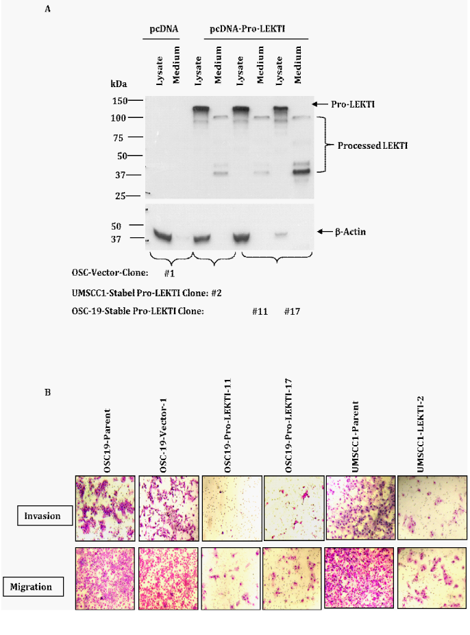 Cell migration and invasion was determined using BD BioCoat Tumor Invasion System that consists of a 24-Mutliwell-insert plate in which a PET membrane (8µm pore size) has been coated without or with Matrigel. OSC19-parent, OSC19-Vector-1, OSC19-LEKTI-11, and OSC19-LEKTI-17 clones suspended in medium without serum were added to the upper wells of inserts, which were then were placed into lower wells containing NIH 3T3 supernatant containing 10% fetal calf serum as a chemo attractant and allowed to invade for 24h in a CO2 humidified incubator. To measure migration alone, parallel wells were set up with control inserts that lacked a Matrigel coating. Alternatively, OSC19-parent cells suspended in medium without serum and treated with recombinant pro-LEKTI were added to the upper wells of control inserts which were then were placed into lower wells containing NIH 3T3 supernatant containing 10% fetal calf serum as a chemo attractant and allowed to migrate for 24h in a CO2 humidified incubator. At the end of each assay, the lower sides of inserts containing migrated or invaded cells are stained and photographed.