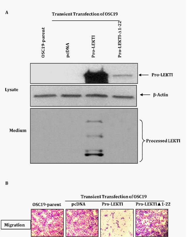 To determine the effect of LEKTI re-expression on cellular migration, we transiently transfected OSC19 cells with pro-LEKTI or pro-LEKTI deleted for the N-terminal secretory sequence. Using these transfectants we first characterized LEKTI expression and then performed migration assays. We observed that the expression of carboxy-terminal hexa-histidine tagged pro-LEKTI with it signal sequence and its processed LEKTI fragments was abundant in the cell lysates and supernatant as shown by its immuno reactivity with LEKTI mAb (Figure 3A). In contrast, deletion of the signal peptide resulted in markedly low levels of pro-LEKTI-∆1-22 in the soluble fraction of cell lysates (Figure 3A), and we could not detect any processed LEKTI fragments in the conditioned medium (Figure 3A). These results are in agreement with our previous studies where we demonstrated that pro-LEKTI is processed and secreted into the medium in HEK 293T cells transiently transfected with the pro-LEKTI expression plasmid whereas the level of pro-LEKTI-∆1-22 in lysates and medium went down dramatically.21