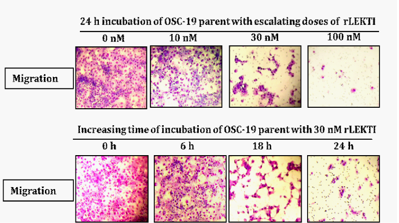 Next, we tested if exogenous r-LEKTI can elicit the inhibition of migration of OSC parental cells. Recombinant pro-LEKTI was expressed and purified from insect cells as described previously.18,23,31 OSC19 parental cells are treated without r-LEKTI or with 10nM, 30nM, and 100nM r-LEKTI for 24h or with 30nM r-LEKTI for 0h, 6h, 18h, and 24h and then cells were allowed to migrate for 24h with control inserts that lacked a Matrigel coating in a CO2 humidified incubator. Migration assays show that r-LEKTI inhibits the migration of OSC19 cells in a dose and time dependent fashion (Figure 4). No inhibition of migration was observed after 6 h incubation with 30nM r-LEKTI but 18h incubation resulted in substantial inhibition and 24h incubation showed almost a total inhibition.
