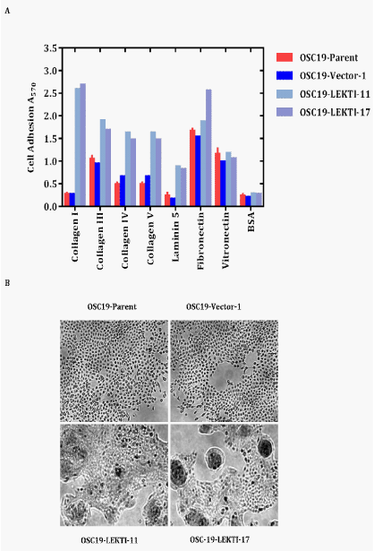 The enhancement of adhesion to ECM constituents along with the alteration in expression pattern of mMPs in LEKTI expressing clones of OSC19 demonstrates a mechanism of impaired invasive capacity. Our findings define a novel role in which LEKTI provides a critical cellular switch from stationary to migratory cell phases.