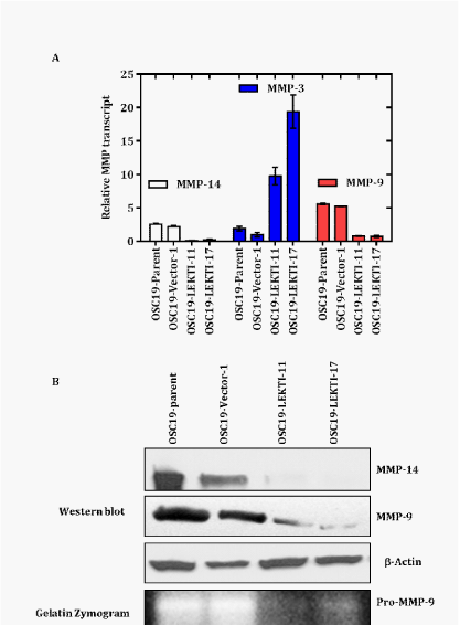 In the present study, we stably re-expressed LEKTI in HNSCC cells and evaluated the effects of LEKTI re-expression on cellular proliferation, morphology, adhesion, invasion and expression of key mMPs involved in tumor progression. LEKTI re-expression in OSC19 cells causes striking morphological changes, strongly enhances adhesion, markedly decreased migration and invasion. Stable re-expression of LEKTI in OSC19 cells resulted in markedly decreased levels of mMP-9 and mMP-14. Furthermore, these results demonstrate a novel negative regulatory role for LEKTI in modulating the production of keymMPs involved in ECM degradation and suggest that loss of LEKTI in HNSCC tumor cells could have a pivotal role in HNSCC progression.