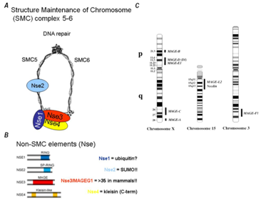 Figure 1 In this figure left panel (A), shows the architecture of SMC5/6 complex.3 There are two sub-complexes, the first comprising Smc5, Smc6 and Nse2, the second made up of Nse1, 3 and 4. Panel (B), Nse1 is an E3 ubiquitin ligase. Nse2 is a SUMO ligase. Nse3 is related to the MAGE family of proteins, which are expressed in many types of tumour cells. Nse4 is related to the EID family and functions as the kleisin. Panel (C), shows chromosomal localization of MAGE family genes. The MAGE-A to -E1 genes are located on chromosome X, while MAGE-L2, G1 and Necdin genes are located on 15q11-13. MAGE-F1 is on chromosome 3.4