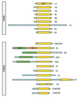 Figure 2 Domain structures of selected MAGE family members are shown, with the MAGE homology domain (MHD) indicated in yellow and MHD2 in green. The jagged lines in the MHDs in MAGE-E1 and MAGE-H1 indicate the presence of truncated MHDs.12