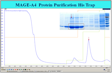 Figure 4 His-Trap affinity column used to purify histidine-tagged MAGE-A4 from bacterial extracts. Chromatogram shows the elution profile with red arrow representing purified fraction peak. The peak fraction samples were run a 15 % SDS/PAGE gel (top right window).