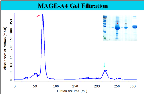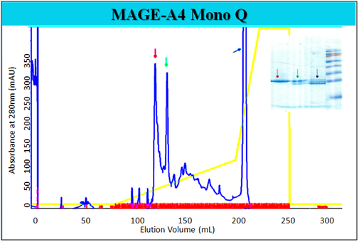 Mono-Q Ion Exchange (IEX) was used as a part of the multistep purification. The estimated MAGE-A4 isoelectric point (pI) is 5.64, and charge at pH 7.34 is -3.9. An anion exchanger was used to separate target protein and its interacting proteins. The unbound molecules elute before the gradient begins and the tightly bound molecules elute in the high salt wash.