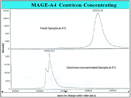 Figure 7 Concentrating MAGE-A4 protein using centricon. Samples were analyzed using mass spectrometry (MS). Top panel, normal N15 isotope labelled sample (MW = 26854 Daltons); bottom panel, centricon treated sample (MW = 22824 Daltons).