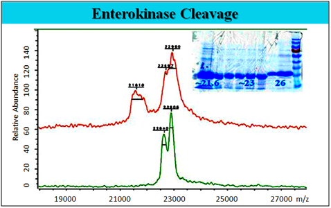 Figure 8 The 48 amino acid tag was cleaved using enterokinase. To get rid of the whole tag, centricon concentrated sample was treated with enterokinase. Samples were analyzed using mass spectrometry (MS). Bottom green panel shows centricon concentrated sample and top red panel shows enterokinase treated sample. These fractions were analyzed on a 15% SDS-PAGE gel (top right corner right to left) Samples with tag (~26 kDa), sample concentrated with centricon (~23 kDa) and enterokinase treated sample (~21.6 kDa) is shown on gel.