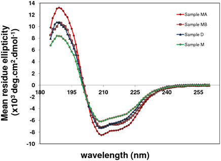 Figure 9 MAGE-A4 variants studied at 25 °C; (Sample M) monomer with full length tag 48 aa, (Sample D) dimer with full length tags, (Sample MA) monomer without tag and (Sample MB) dimer without tag.