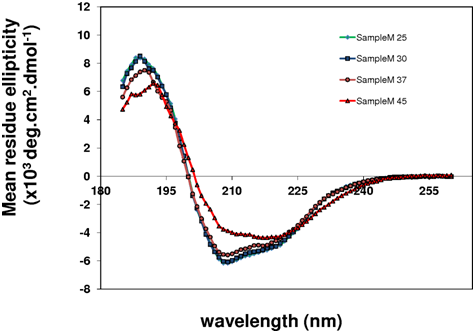 Figure 10 Melting temperatures (Tm) of MAGE-A4 (Sample M) measured using CD. Unfolding of MAGE-A4 monomer with long tag between 37-45 °C was observed.