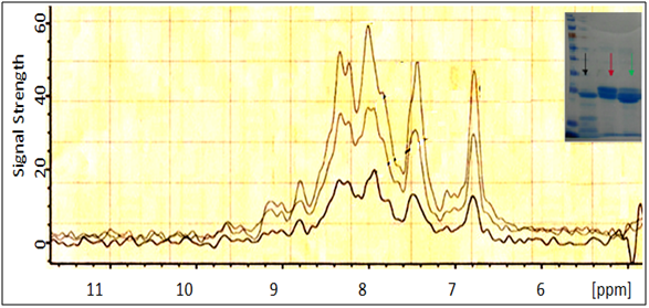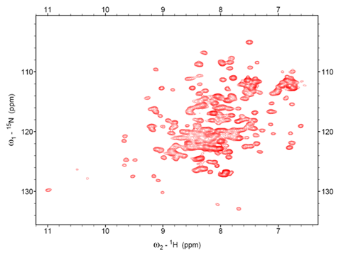 In general, each residue would produce an observable peak in the spectra, with the exception of proline which lacks an amide proton. In a typical HSQC spectrum, the NH2 peaks from the side chain of asparagine and glutamine appear as doublets in the top right corner. The side chain amide peaks from tryptophan are usually shifted downfield and located near the bottom of the left corner. The backbone amide peaks of glycine normally appear near the top of the spectrum. In order to check whether MAGE-A4 is well suited for NMR Spectroscopy, the 1H-15N HSQC spectrum was acquired using a 15N-labeled protein. In this spectrum, the peaks are well-dispersed meaning that the MAGE-A4 protein is folded, and most of the individual peaks can be distinguished. The number of peaks was close to the expected number of peaks based on the amino acid sequence (Figure 11). The tag part of the recombinant protein is often unfolded and flexible, being thus expected to be invisible in the HSQC spectrum.