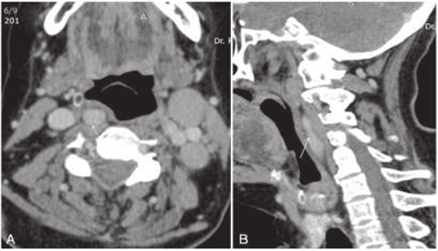 A 23 year old patient who is known case of Non-Hodgkins lymphoma on chemotherapy presenting with swelling on both sides of neck and there was a pulsating mass seen on left side in. The CECT scan of the patient was done and it showed (Figure 1 A&B) posterior pharyngial wall bulging a on right side (white arrow) with aberrant course of right ICA which shows medialisation. Note was also made of enlarged lymph nodes at station IIa and IIb on left side cervical regions. Diagnosis of medialisation of ICA on right side was made besides patient a known case of Non-Hodgkins lymphoma (Figure 1).