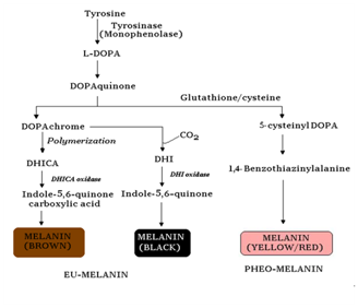 Tyrosinase, a copper containing enzyme is the key enzyme in melanogenesis. It catalyzes the first step of melanin synthesis. Tyrosinase is responsible for the conversion of tyrosine to L-DOPA and DOPA quinone. After DOPA quinone formation by tyrosinase, the compound is converted into cysteinyl DOPA (in the presence of cystein) and DOPA chrome (in the absence of cystein) through auto-oxidation. These compounds are further converted into different melanins through a series of enzymatic and spontaneous reactions. Eumelanin is formed through reactions from dihydroxyindole (DHI) and dihydroxyindole-2-carboxylic acid (DHICA) which are the reaction products of DOPA chrome (Figure 1). Subsequently pheomelanin is formed by the oxidative polymerization of cysteinyl DOPA.9–11 Though there are three enzymes involved in melanogenesis pathway, only tyrosinase is extremely important for melanogenesis, as it plays a key role in the process. Tyrosinase is a glycoprotein positioned in melanosome membrane with an inner melanosomal domain that holds the catalytic region, followed by a short transmembrane domain and a cytoplasmic domain. The remarkable characteristic observed in tyrosinase is that a central copper-binding domain is conserved, which contains strictly conserved amino acid residues, including three histidines. Tyrosinase is produced only by melanocytic cells. It is synthesized and subsequently processed in endoplasmic reticulum (ER) and Golgi bodies, and then it gets trafficked to melanosomes, in which the pigment melanin is formed.12–16