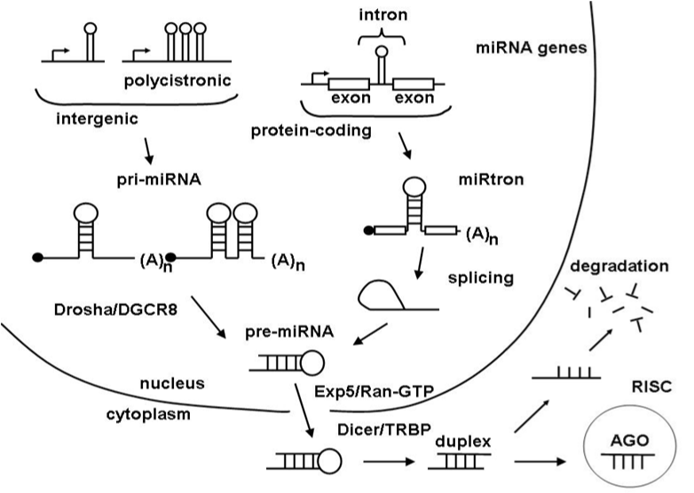In animals miRNA gene is transcribed by RNA polymerase II in the cell nucleus in the form of long single-stranded precursor (pre-miRNA) transcripts that fold into very stable long hairpin structure. Starting from the cell nucleus and continuing on a few possible roads and processing steps toward the cytoplasm mature miRNA is excised from one of the stem arms of pre-miRNA hairpin. In the cytoplasm mature miRNA is loaded on a RISC protein complex and start to search for targets (Figure 1).22,23 The instruction for target recognitions is coded in a mature miRNA nucleotide sequence. Based on sequence homology, miRNAs can be grouped into sub-families, and many of them are evolutionarily conserved.24,25 Some miRNAs have tissue-specific or developmental-stage-specific expression patterns and their abundance can vary greatly depending on cell type.26
