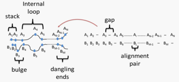 The equivalence between alignment and hybridization allows integrating both the energy-based and evolutionary-based information of sequence/structure covariations to predict the simultaneous folding/co-folding and alignment of RNA/DNA sequences. This can be done by integrating evolutionary and thermodynamic partition functions in the frame of dynamic programming algorithm (Figure 3).52