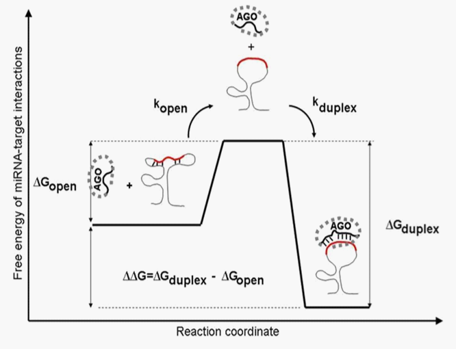 Structural aspects include computational approaches for co-folding of two interacting nucleotide sequences including all possible conformational states like – matches, mismatches, bulges, symmetric and asymmetric interior loops, multi-branched loops and kissing loops in the regions where the two sequences fold separately and in the regions where they interact. Interaction regions and their conformational states are important for miRNA-mRNA interactions.56,57 Previous work revealed that 7-8 nucleotides of the so cold seed region at the 5’ end of the miRNA are responsible for target recognition.58 The seed region is small so is the target side, but it can be part of a bigger folded region of mRNA sequence. A portion of the mRNA where target site resides and is involved in intramolecular base-pairing has to become locally accessible to a targeting miRNA. The overall free energy to go from folded to unfolded state of this portion of mRNA and the hybridization of the target site of the unfolded portion with the 5’ seed region of miRNA is the driving force of this reaction. Therefore, the overall successes of miRNA binding to mRNA depend on mRNA length, its available secondary structures at thermodynamic equilibrium, binding side accessibility and thermodynamic stability of miRNA-mRNA duplex (Figure 4).56,59–61 One has also to include competition between different miRNAs or between miRNAs and proteins for the same target side. In this case concentrations of mRNA, miRNAs and proteins play crucial roll. The concentration of individual miRNAs in cells may vary by four orders of magnitude.62 This is even more important when there is more than one target side. Depending on the distance between target sides and miRNAs concentrations cooperative or competing mode of action have been reported to be predictive for the functionality of miRNA target sites. Effective modeling of saturation of binding and competition on binding sites is still in its infancy.63 Interestingly, recently it was found that miRNA genes that produce identical or nearly identical mature miRNAs have distinct biological activities that are controlled by their pri/pre-miRNA loop sequences. These raise the possibility of pri-/pre-miRNAs as target-recognizing RNA species.64 Sequence aspects include the sequence composition of the 3’ UTRs or of the immediate environment of the putative target sites to make interaction of target side with other portions of mRNA less effective and make target sides more accessible;59,65 the base-pairing pattern in the 3’ region of the miRNA;66 conservation of the miRNA binding site – it has been shown that conserved perfect seed matches to miRNAs have reduced SNP density which indicate that target sides are under purifying selection.67 It was also shown that nucleotide words complementary to miRNA seed regions are better conserved in 3’ UTRs than “random words” of the same length.17 However, there are experiments which question whether a seed match is either necessary or sufficient for miRNA repression: showing that perfect base pair matching does not guarantee interaction between miRNA and target gene, and wobble G:U base pairs are often tolerated in target sites.68 Taking advantage of miRNAs conservation we can use known mature miRNA sequence in one species to detect the probable location of its orthologue in another species, or further paralogues in the original species, by combining sequence analysis, sequence alignment and RNA secondary structure prediction.69 However, given the numerous rules and exceptions one needs an integrated statistical model to determine the most optimal prediction scenario.
