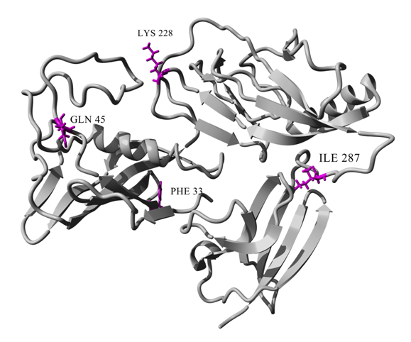 Figure 1 Cartoon representation of modeled SKG132 showing Phe33, Gln45, Lys228 and Ile287 mutations. The color scheme of SKG132 is gray and mutations in SKG132 represented as stick models in dark pink.