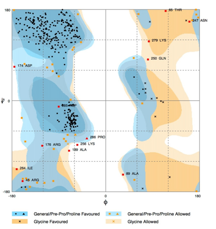Figure 2 Ramachandran Plot validation for the best predicted model of SK structure. Ramchandran map were generated by Rampage validation program. Results indicated that 86.8%, 9.7% and 3.5% of all the amino acid residues were in the favored, allowed and outlier regions, respectively.