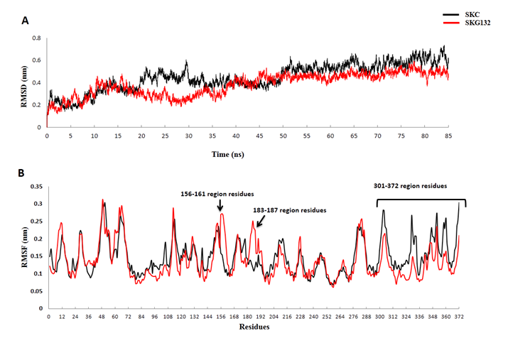 Figure 3 Evolution of the structural properties of the SKG132 and the SKC (black) during the MD simulations. Representation of the change in the root mean square deviation (RMSD) of C-alpha atoms (Cα-RMSD) of the SKG132 and SKC structures over the course of 85ns simulations with respect to the minimized structure. Cα-RMSD values of both structures converged within the last 25 ns of simulation, (B) The root mean square fluctuation (RMSF) of Cα atoms (Cα-RMSF) for both SKC132 and SKC were calculated from the last 25 ns structures of each simulation and values generally indicated significant changes of flexibility in three regions including 156-161, 183-187 and 301-372 in SKG132 compared to SKC. Specific regions in SK are indicated by arrows.