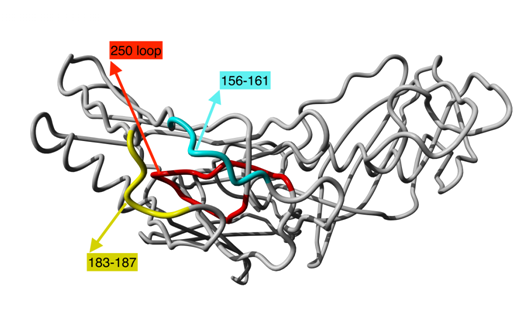 Figure 4 The cartoon representation of the enhanced flexible regions (156-161, 183-187) which are spatially located around 250-loop in SKG132. The 250 loop, 156-161 and 183-187 can be observed in ribbon and are colored in red, cyan and yellow, respectively. The structure is the average PDB structure of SKG132 which retrieved from the last 25 ns of MD simulations.