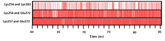 The average number of H-bond per residue in 156-161 and 183-187 of SKC was 0.08 and 0.36, while it was 0.05 for both flexible regions in SKG132. Furthermore, the average number of H-bonds in 301-372 region of SKG132 was 53, while it was 50 in SKC. The average number of H-bond per residue for 301-372 region was 0.74 in SKG132 and 0.69 in SKC (Table 1).PIC server was used for computing intramolecular interactions of crucial residues for both SKC and SKG132 structures which achieved from the last 25 ns of simulation. Results of various interactions showed that the H-bond between Lys256 and Lys183 of (183-187) was disappeared in SKG132,while it was present in SKC with occupancy rate of 35% (Figure 5).24 Moreover, H-bond between residue pairs of Glu272-Lys256 and Glu272-Lys257 were also absent in SKG132, while they were existed in SKC with 94% and 100% occupancy, respectively (Figure 5).