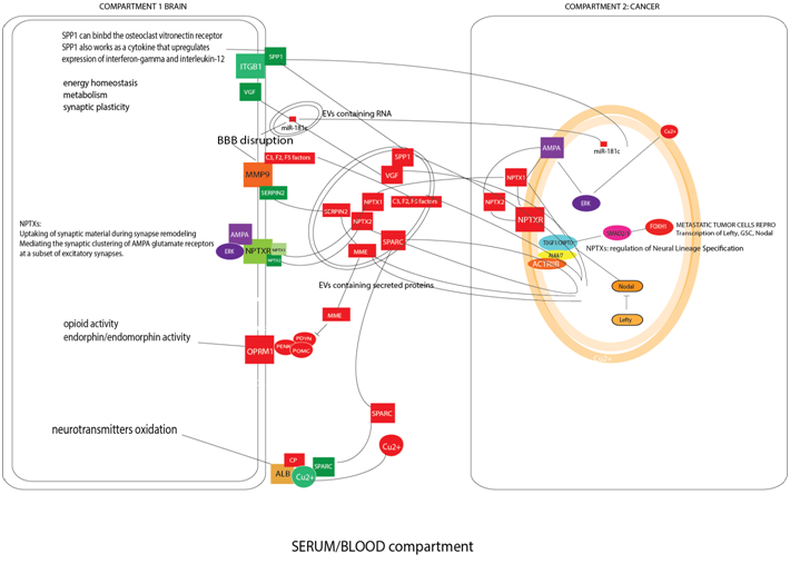 When the BBB is disrupted, factors released by cancer tissue enclosed in EVs could communicate with the CNS. We will now briefly describe three of the protein clusters released by cancer tissue in EVs that are involved in neuronal signaling mechanisms and that are summarized in Figure 1: the Neuropentraxines/Cripto/AMPA system, the Neprilysin/Enkephaline metabolism and the Copper/Ceruloplasmin pathway. Up to date, it is not clear how these pathways are connected to the monoamine neurotransmitters and neuromodulators metabolism and what their impact is in depression. A necessary precondition for having an impact on patient mood, however, is the ability of these molecules to cross the BBB, a step that may be facilitated by the release of the MMP9/SERPINE2/coagulation factor complex by cancer tissue. NPTX1, NPTX2 (two neuropentraxines, synaptic proteins related to C-reactive protein) are dramatically down-regulated in Major Depressive Disease subjects. Their receptor NPTXR is implied in neuronal plasticity and when it is detected in the cerebrospinal fluid it represents a potential biomarker for neurodegenerative diseases. NPTX1 and NPTX2 appear to be over-secreted by cancer tissue. NPTX1 is fundamental in the Epithelial-Mesenchymal Transition of melanoma metastasis acting on the Cripto receptor and promoting SMAD4 transcription and neural differentiation of the melanoma metastases.10,11 NPTX2 plays a role in clustering of alpha-amino-3-hydroxy-5-methyl-4-isoxazolepropionic acid (AMPA)-type glutamate receptors at established synapses resulting in non-apoptotic cell death of dopaminergic nerve cells via inhibition of the ERK pathway.12 The same anti-apoptotic mechanism was identified in cancer, as demonstrated in studies of renal cell carcinoma expressing NPTX2.13