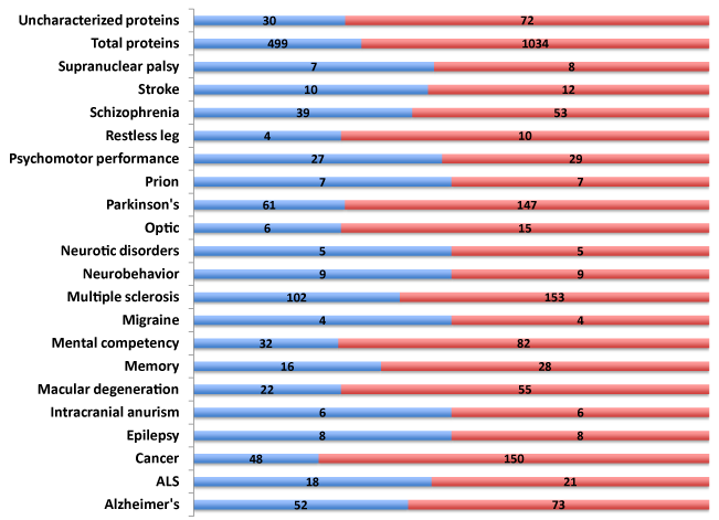 Polymorphic traits, SNPs (n=1,034) associated with diverse neurological diseases and disorders were identified (Figure 1). These SNPs were present in 499 genes encompassing both the known and novel, uncharacterized protein open reading frames (ORFs). Alzheimer’s Disease, mental competency, multiple sclerosis and Parkinson’s disease harbored the largest number of polymorphic SNPs and associated genes (Supplemental Table S1).