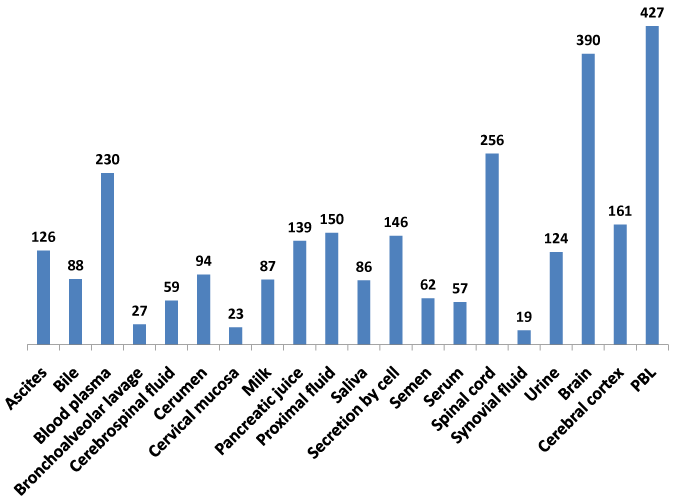 The recent availability of the human proteome map dataset for protein expression in multiple tissues and body fluids18,19,39 enabled this study to develop a comprehensive baseline protein expression dataset on the NeuroGenes (Figure 3). A composite protein expression dataset was generated using the MOPED, the Human Proteome Map and the ProteomicsDB databases. The NeuroGenes protein expression was detected in diverse body fluids including ascites, cerebrospinal fluid, milk, saliva, serum, semen and urine. Most of the Neurogenes were detected in the brain, spinal cord tissues and peripheral blood lymphocytes (Supplemental Table S4). This baseline analysis for protein expression in normal human body fluids establishes a framework for biomarker screening efforts for diverse neurological diseases.