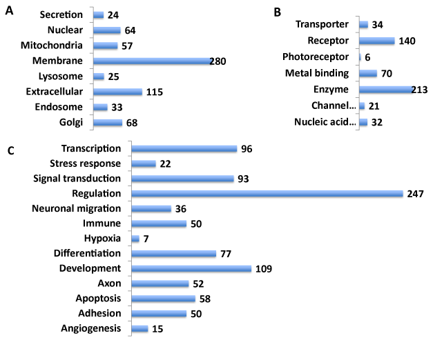 To add to the NeuroGenes knowledgebase, the Gene Ontology was investigated next using the GeneALaCart Meta Analysis tool (Figure 4). The proteins were classified into cellular location (Panel A), function (Panel B) and processes involved (Panel C). The largest number of proteins was found to be membrane bound (280/499). In addition, extracellular, secreted, nuclear/mitochondrial/Golgi as well as cytoskeletal proteins were inferred (Panel A; also Supplemental Table S5). The NeuroGenes encompassed druggable targets including channel proteins, transporters, receptors and enzymes (Panel B). Enzymes constituted the largest druggable class of proteins (213/499). The NeuroGenes were implicated in diverse biological processes such as angiogenesis, apoptosis, axon, differentiation and development, immune function, neuronal migration and signal transduction (Panel C). The largest number of NeuroGenes was associated with regulation of gene expression (247/499).