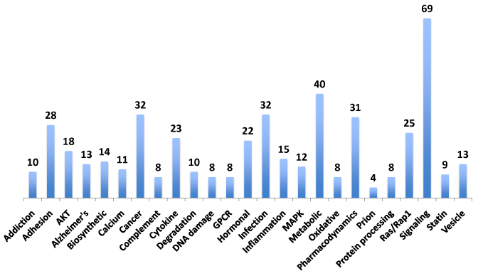 Numerous FDA-approved drug hits and well as other compounds which target the NeuroGene’s pathways were identified including statins, Cyclosporine A, Donepezil, Rosiglitazone (Alzheimer’s disease, cognition), antivirals such as ritonavir and Ganciclovir, hormones including Estrogen and Testosterone, Verapamil, Isradipine (gating inhibitor), Diltiazem (Channel blocker), Gemtuzumabozogamicin, Cisplatin and Methotrexate (antineoplastics) and antibiotics such as rapamycin, Tunicamycin (Supplemental Table S11) for complete details).