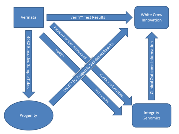 The equivalency feature is created by the transferal of blinded samples from the reference laboratory (Verinata) to Progenity, while at the same time transmitting the reference test results to the adjudicator (White Crow Innovation, LLC Ann Arbor MI). The clinical follow-up feature was performed by Integrity Genomics (Charleston SC), which received test results and demographic information from Verinata. Privacy of patient information sent to White Crow Innovation was ensured in that WCI never had access to patient demographic information. Verinata sent test results with only an internally meaningful 2D bar code. Progenity sent WCI results with the same 2D bar code as identification. Integrity Genetics had access to the patient demographic information, and the 2D bar code, but did not transmit the names and other confidential information to WCI.