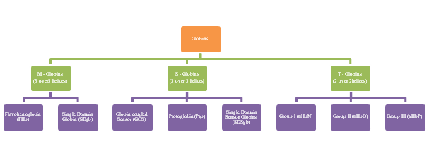 he presence of hemoglobins (Hbs) has been reported in all forms of life; from simple prokaryotes to complex eukaryotes; and share a common characteristic of reversible oxygen binding.1 These globins play a role in diverse functions, such as, oxygen transport, storage of oxygen, terminal oxidases, oxygen sensors and are also involved in response to oxidative and nitrosative stress.2–6 The structures of vertebrate myoglobin as well as hemoglobin have a typical tertiary structure consisting of 8 alpha helices (A-H) arranged in 3 over 3 topology connected by short intervening loops.1 All the globins are classified into three distinct lineages; the M (myoglobin like) family, the S (sensor) family, and T (truncated) family.7,8 Flavohemoglobin (FHb) and single domain globin (SDgb) constitute the M globin family; the S family comprises of globin coupled sensor (GCS), single domain sensor globin (SDSgb) and protoglobin9,10 (Figure 1). T globins are usually 20-40 residues shorter than the vertebrate Hbs and display 2 over 2 helical structures. T-globins are further classified into group I, II and III designated as trHb1, trHb2, and trHb3 respectively.3,11,12 In all the globins, His-F8 is the strictly conserved residue that forms co-ordinate bond with the iron of the heme.