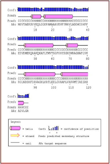 The PSIPRED v3.3 results revealed that only helices and coil are secondary structure elements found in amino acid sequences of the trHbN of M. xanthus DK1622 (Figure 2).