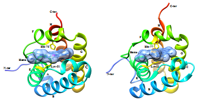 The metal ion geometry for the predicted model as well as trHb1 of C. rheinhardtii was compared using UCSF Chimera 1.10. It was found that the residues interacting with the iron of heme in predicted model of the trHbN of M. xanthus DK1622 are His-75 and Lys-51 with octahedron geometry and coordination number as six; similar geometry was found in the crystallized structure of THB1 of C. reinhardtii with residues His-77 and Lys-53 (Figure 4) (Figure 5). This further supports the conclusion that trHbN of M. xanthus may be hexacoordinated with 2 proteinaceous ligand, histidine-75 and lysine-51.