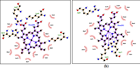 Other residues that may be involved in interaction with heme are phenylalanine-40 (CD1), phenylalanine-55 (E14) and tyrosine-66 (EF6). It was observed that Arginine-47, present in trHbN of M. xanthus in place of lysine-49 of 4XDI, interacts with one of the propionate heads of the heme. Lysine-69 interacts with second heme propionate head through hydrogen bond whereas in the trHb1 of C. rheinhardtii Arginine- 52 interacts with this propionate head. Heme is embedded in the hydrophobic region of the protein known as heme binding pocket, which is composed of hydrophobic amino acids to protect the solubility of heme and these hydrophobic amino acids stabilize heme through vanderwaals interactions in all 2/2HbNs as shown in ligplot (Figure 6).