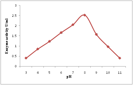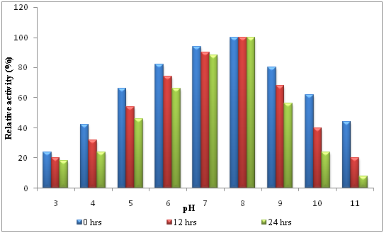 Effect of pH on enzyme activity and stability: In order to determine the effect of pH on purified L-asparaginase, the purified enzyme was pre-incubated in 0.1M buffer in the range between pH 3 and pH 11 without the addition of substrate, the enzyme activity was determined under standard assay conditions. Buffers used were sodium phosphate-citrate (pH 3.0-6.0), tris-HCl (pH 7.0-9.0) and glycine-NaOH (pH 10.0-11.0). In order to determine the pH stability, the purified enzyme was pre-incubated in pH buffer range between pH 3 and pH 11 at room temperature for 24hrs. The residual activity was determined for every 12hrs intervals under standard assay conditions. The activity of the enzyme at zero minute of the reaction was considered as 100% and served as control.