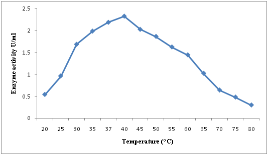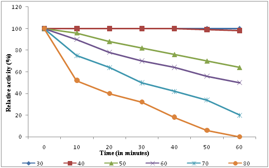 Effect of temperature on enzyme activity and stability: In order to determine the effect of temperature on purified L-asparaginase, the enzyme activity was studied at different temperatures ranging from 20°C to 80°C at 5°C increments, the enzyme activity was determined under standard assay conditions. Thermal stability of the purified enzyme was evaluated by incubating the enzyme for 10, 20, 30, 40, 50, 60minutes at different temperatures ranging from 30°C to 80°C. The residual activity was determined under standard assay conditions. The activity of the enzyme at zero minute of the reaction was considered as 100% and served as control.