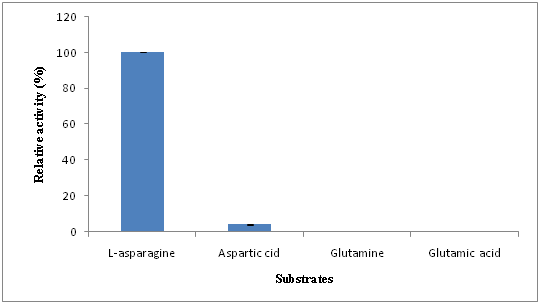 To assess the activity of L-asparaginase, different substrates such as L-asparagine, L-aspartic acid, L-glutamine and L-glutamic acid were used. The substrates were prepared in 0.05M tris- HCl buffer pH-7.5 at 10mM concentration. The enzyme was mixed with substrate and the reaction mixture was incubated for 30min at 40°C and enzyme activity was determined. Results were expressed as relative percentage.