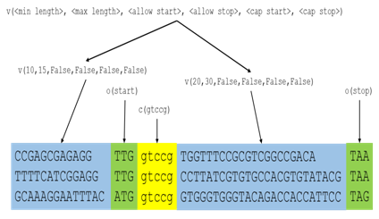 Mixed sequence (MS) method can be seen as a combination of FLS and VLS methods with constant regions. As such, it is a versatile method to generate any sequences. The specification of sequence is done through statement option, which consists of three possible definitions; namely, c for constant region, v for variable region, and o for operator region. A constant region is given as a string. For example, c (GAATTC) defines a constant region of GAATTC. Operator region accepts start and stop as parameter; for example, o (start) and o (stop) define a start codon and a stop codon respectively. Variable region definition takes 6 parameters, which corresponds to the 6 options of VLS; namely, min_length, max_length, allow_start, allow_stop, cap_start, and cap_stop. Hence, the following command