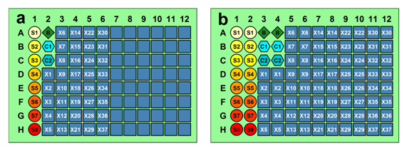 Figure 1 Sample and assay plate layouts for replicate analysis. (a), the recommended sample plate layout for 8 standards (S), 1 blank (B), 2 controls and 37 tests samples (X). (b) Assay plate layout constructed from the sample plate layout by replicating each sample column. The reference samples are represented by circle = standard (S), diamond = blank (B), and hexagon = control (C), while the test-subject samples (X) are represented in squares.
