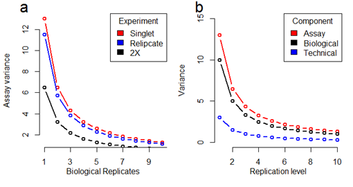Biological replicates are parallel measurements taken from different individuals or distinct biological samples. Technical replicates are repeated measurements on the same biological sample. Given that the total variation in assay measurement is the sum of variances of each effect biological and technical, weighted by the number of times each effect has been independently sampled.10 Let the variance, in the measurement of a subject’s analyte response due to biological variance be vb and technical variance be vt. Then, the variance in response from a single assay vb+ vt is that is, the sum of the individual variances. The variance of each source is divided by the number of times that source is independently sampled. If biological replicates are assayed in replicate then, the single assay variance is vb+vt/2 and for n biological replicates analysed in replicate the assay variance becomes vb/n+vt/2n. Now by dropping the technical replicates and increasing the numbers of distinct biological replicates for analysis 2 fold (2X), the experimental assay variation becomes: vb/2n+vt/2n. The effect on the observed assay variance depending on experimental designs is shown Figure 2a.