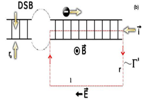The first process is quantum-coherent, in the sense that the electron does not exchange any energy with the molecule during the transfer. Additionally, for short-distance motion (over a few base pairs), coherent tunneling can occur but exhibits an exponential decay as a function of the traveled distance (b). In fact, an exponential decay of the conductance (C) with increasing distance (b) has been observed directly in DNA molecules folded into hairpin shapes (Figure 1).14 Therefore, an equally strongly varying electric current is established. Well-known in Electrodynamics, an electric current generates a magnetic field, and that if this field changes with time an electric field is also induced (Figure 1). In the particular case of an electric current in damaged DNA, as depicted above, a short duration electric pulse (a transient) is produced, as shown in Figure 2. Detailed calculations are presented in the Appendix 1.